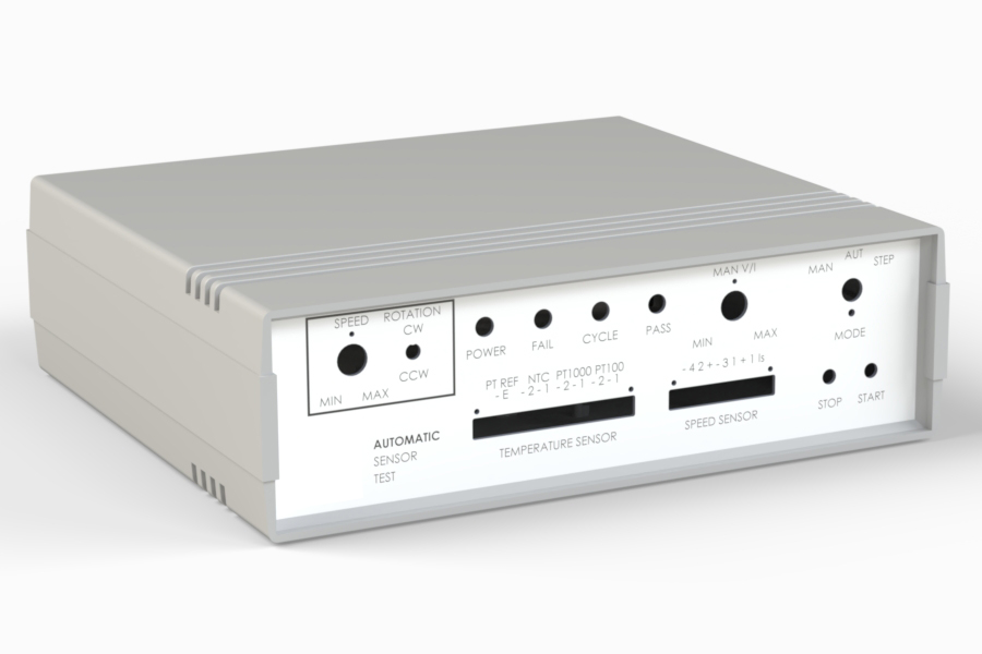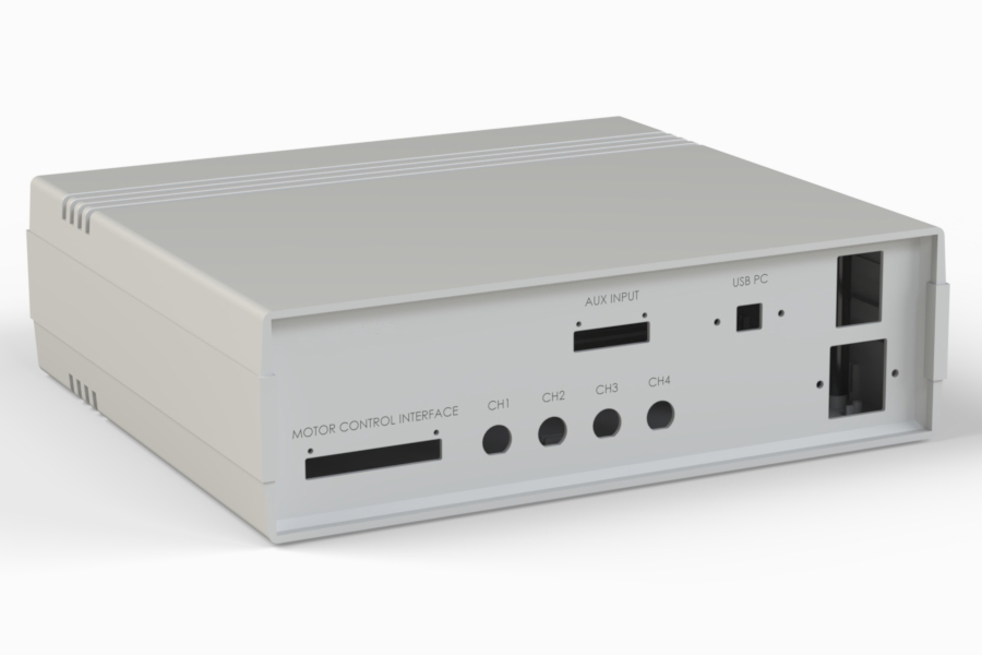 Kunststoffgehäuse mit eingesteckten Front- und Rückplatten. Unterteil und Deckel haben Führungen und Montagepfeiler für PCB. Verschluß mit vier Schrauben.