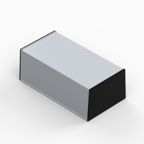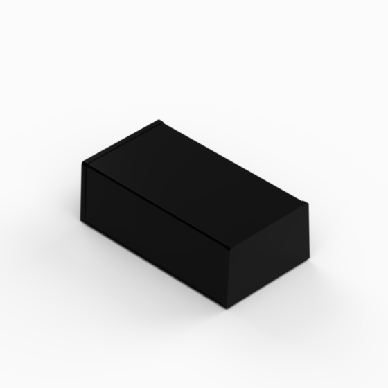 Kunststoffgehäuse mit zwei zusammenschnappbaren Hälften (1 Unterteil / 1 Deckeloberteil) einfarbiger (schwarz) oder zweifarbiger Ausführung. Das Unterteil ist immer schwarz und hat integrierte Führungen und Montagepfeiler für PCB. Zur Montage sind keine Schrauben nötig.