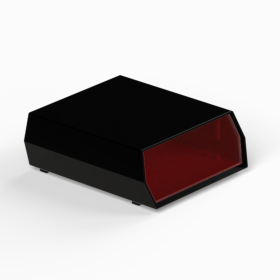 A polystyrene enclosure with a red polystyrene 20° inclined panel. Each half-shell has integral PCB mounting studs. The models “D/13” and “D/14” have in the rear side a cutout for cabling. Matt surface finish. Closing by four screws.